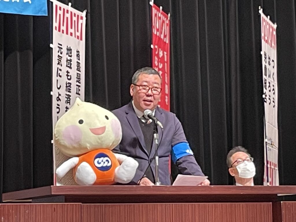 主催者を代表して阿部事務局長は、2026春季生活闘争について「①2026春闘は実質賃金上昇に向けた正念場である。実質賃金を1%上昇軌道に乗せ、これからの”賃上げノルム”としていきたい。②格差是正にもこだわっていく。2026年1月から中小受託取引適正化法が施行されたことを踏まえ、適切な価格転嫁、適正取引を求めていく。③2026春闘では、ジェンダーの課題にも積極的に取り組み、規模間、雇用形態間、男女間での格差是正にもこだわって取り組みたいと挨拶をした。