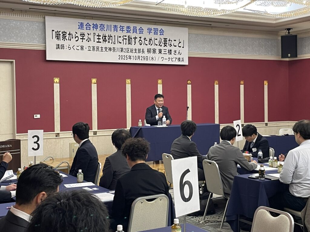 講師に柳家 東三楼さん(らくご家/立憲民主党神奈川第2区総支部長)を迎え、「噺家から学ぶ『主体的』に行動するために必要なこと」と題し、ニューヨークでの落語や政治家への挑戦など、ご自身が積極的に生きてきた経験(決断・行動)について、講演していただきました。