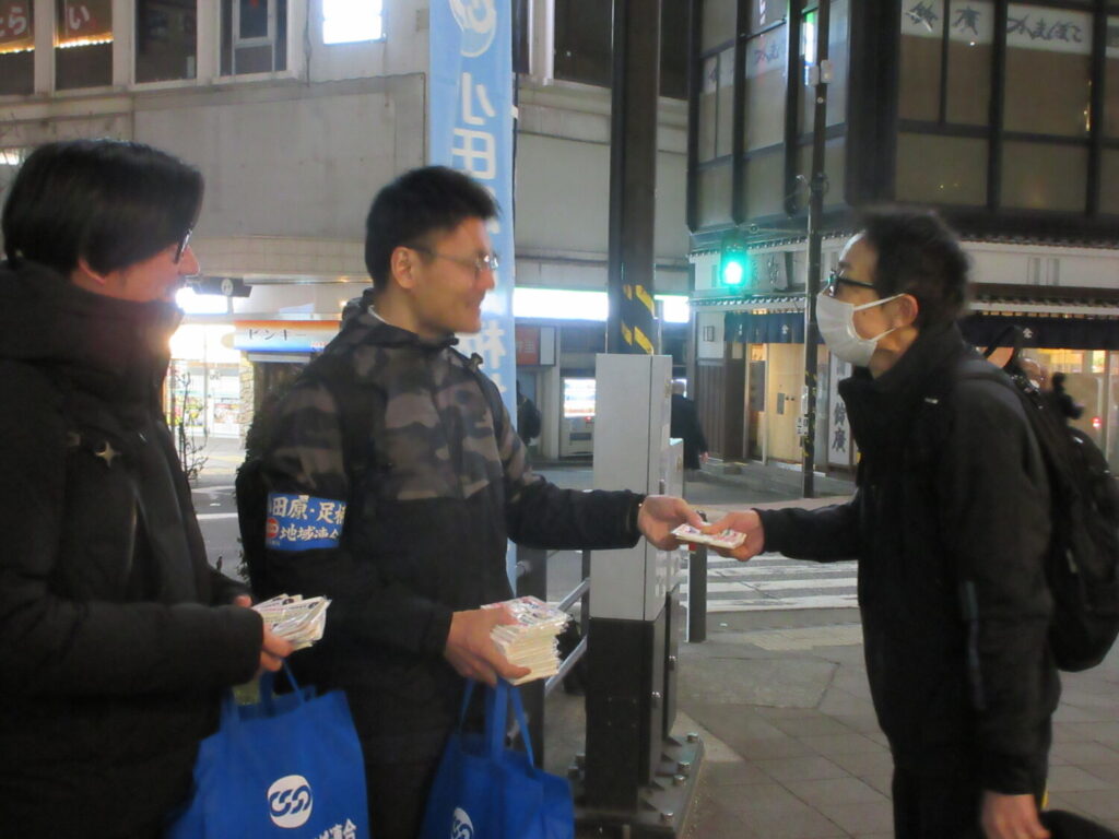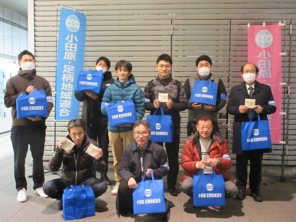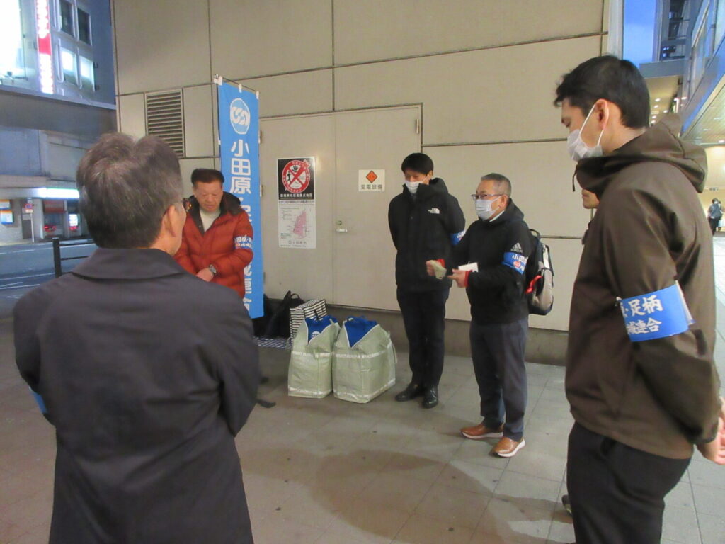 小田原・足柄地域連合は、3月9日(月)に小田原駅東口周辺にて、「36協定の適正な締結、点検・見直しに取り組もう!」「労働安全衛生法等の改正」を合言葉に、地域連合五役・幹事および連合議員団の清水たかお小田原市議、笠井裕太大井町議の15名で街頭行動を実施しました。