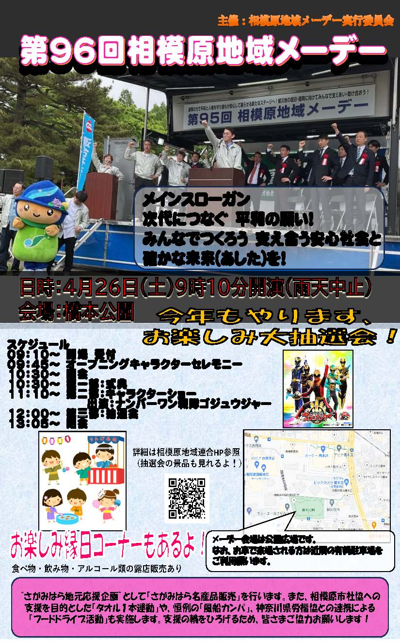 第96回相模原地域メーデー開催連絡 2025年4月24日 最終更新日時 : 2025年10月27日 相模原地域連合 2025年4月26日開催の第96回相模原地域メーデーは予定通り開催します。 みなさんふるってご参加ください。