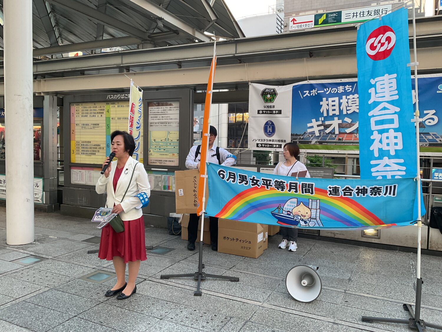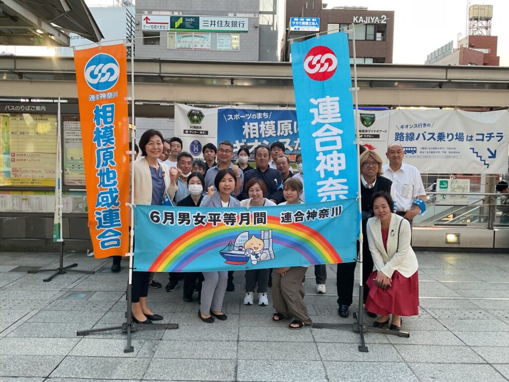 2024年6月13日 相模大野駅にて連合神奈川「男女平等月間」の取り組みとして、街頭のチラシ配りを行いました。